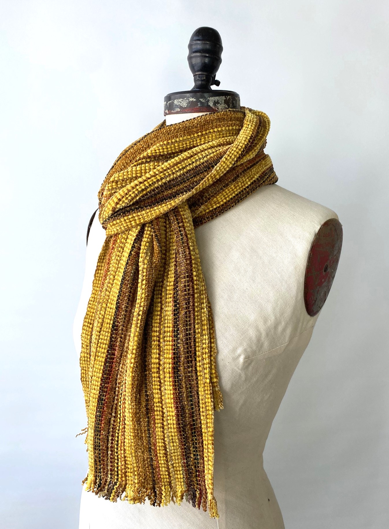 Our chenille songbird stripe scarf gets its nubby ribbed texture from a warp of thick and thin yarns. The muted shades are accented with pops of color inspired by the feathers of North American songbirds. This scarf’s subtle striping makes it easy to wear with patterns and solids. With a soft, velvety hand, this scarf works well wrapped around the neck a couple times or in a french loop. Short fringe. For men or women. Handwoven in our Saratoga Springs, NY weaving studio on vintage Macomber looms.